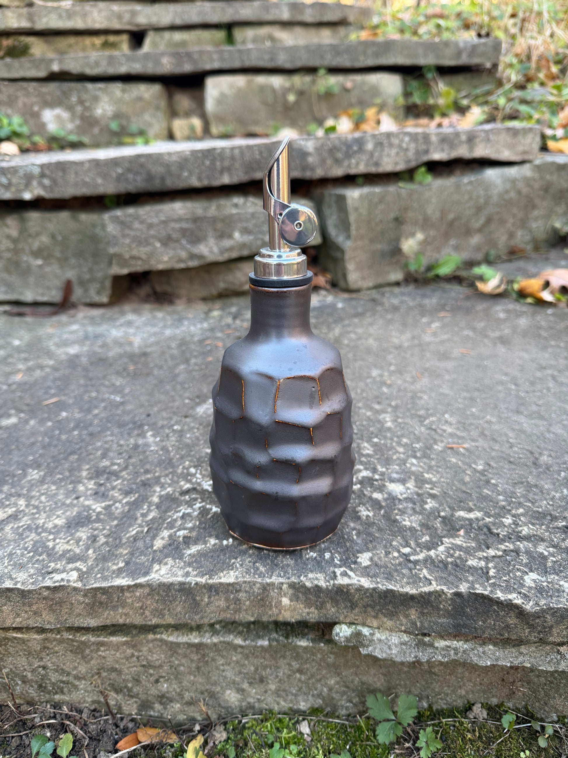This piece is wheel thrown with a hand carved faceted decoration. Perfect for storing oil next to the stove for easy access while you're cooking, or for storing a simple salad dressing for your table. Comes with a metal pour spout with a rubber fitting. 7.5" in height.